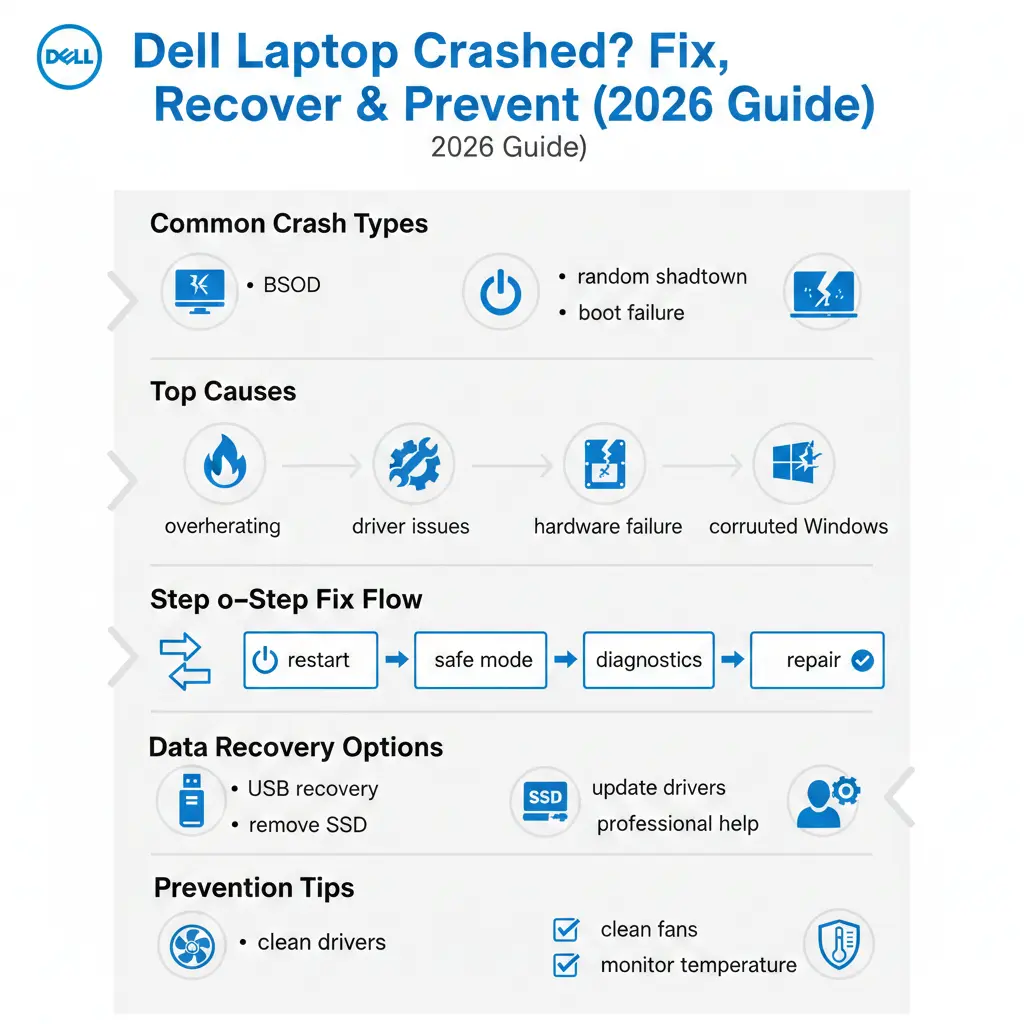 Dell laptop crash suddenly? This infographic shows crash types, exact causes, quick fixes, data recovery options, and proven prevention tips in one glance.